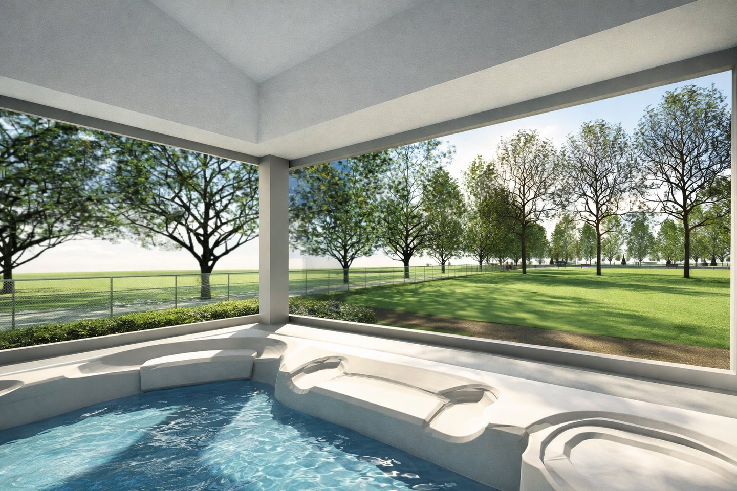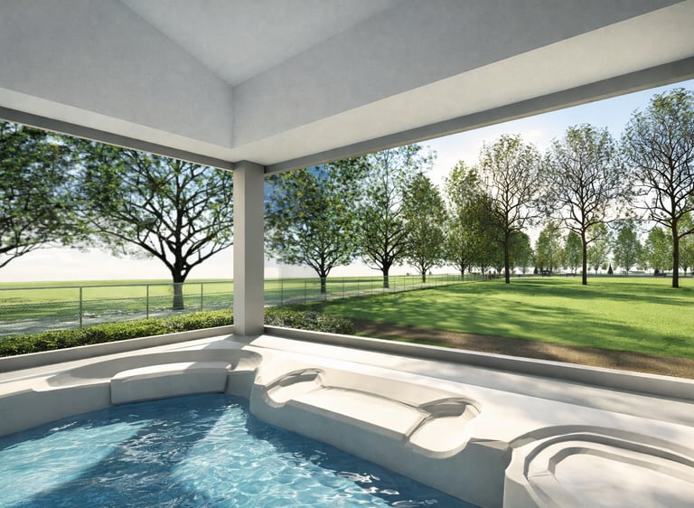 Indoor hot tub with large panoramic windows to enjoy the views of the countryside.